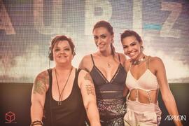 Retrato de Barbará Bombom com DJs no palco da Avalon Club